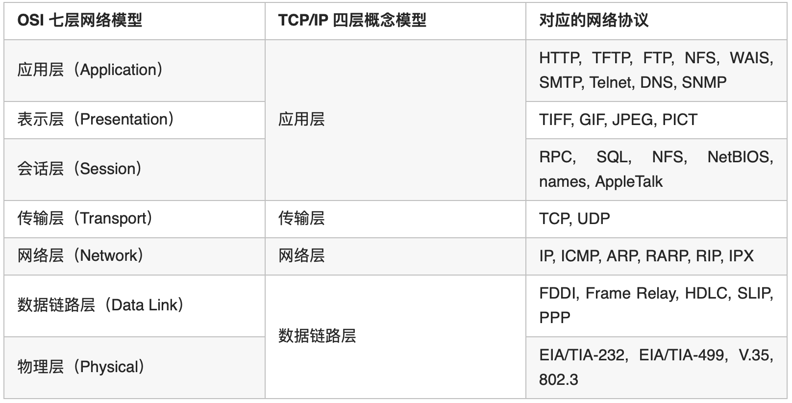 | OSI 七层网络模型 | TCP/IP 四层概念模型 | 对应的网络协议 |