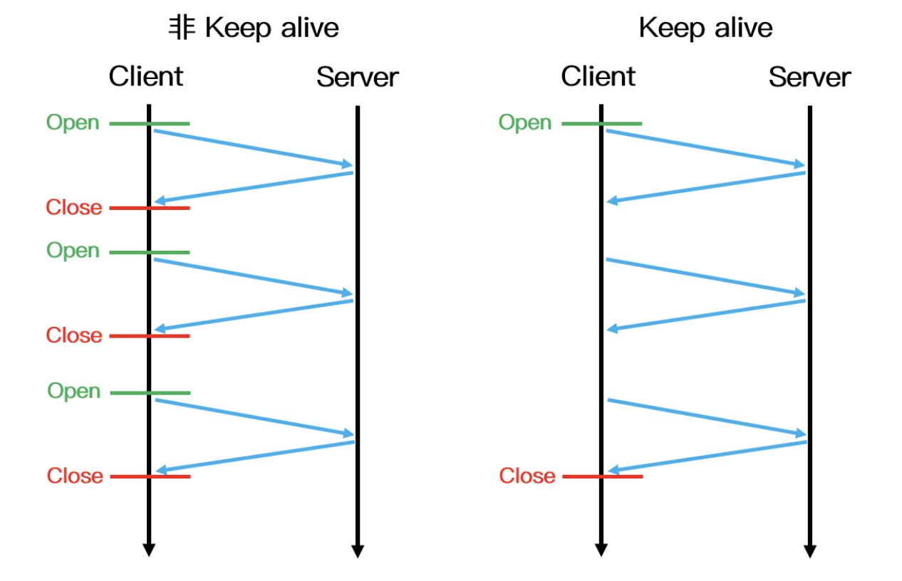 在早期的 HTTP/1.0 中,浏览器每次 发起 HTTP 请求都要与服务器创建一个新的 TCP 连接,服务器完成请求处理后立即断开 TCP 连接,服务器不跟踪每个客户也不记录过去的请求。然而创建和关闭连接的过程需要消耗资源和时间,为了减少资源消耗,缩短响应时间,就需要重用连接。在 HTTP/1.1 版本中默认使用持久连接,在此之前的 HTTP 版本的默认连接都是使用非持久连接,如果想要在旧版本的 HTTP 协议上维持持久连接,则需要指定 connection 的首部字段的值为 Keep-Alive 来告诉对方这个请求响应完成后不要关闭,下一次咱们还用这个请求继续交流,我们用一个示意图来更加生动的表示两者的区别: